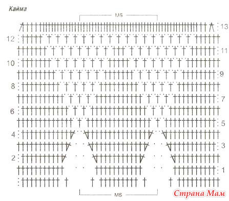 1-й ряд: * 1 столбик с накидом, 2 воздушные петли, повторять от *, закончить 1 столбиком с накидом.