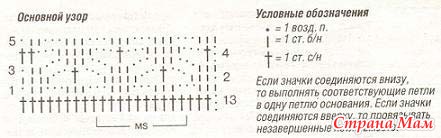 1-й ряд (круговой): * 1 столбик без накида, 3 воздушные петли, 1 столбик без накида в первый столбик без накида, пропустить 2 петли основания, повторять от *